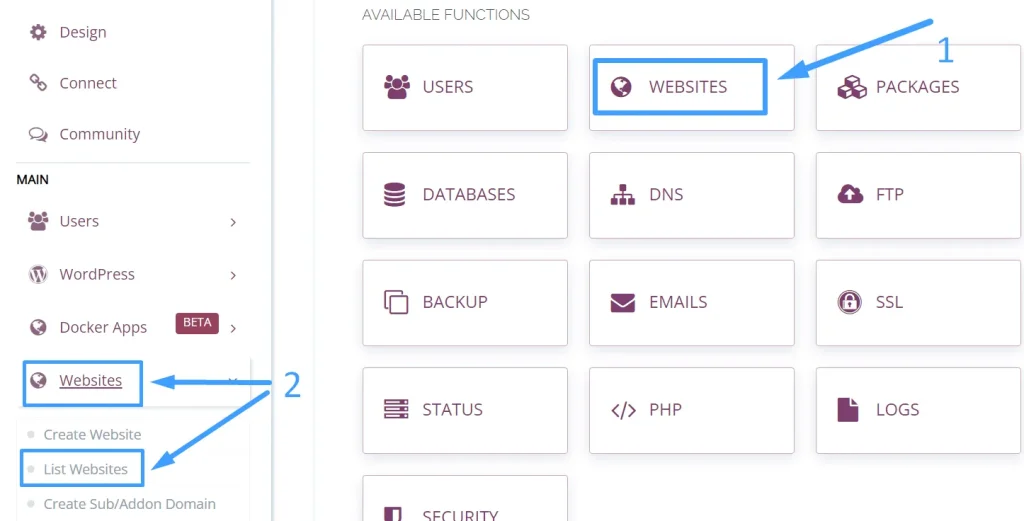 Từ trang dashboard của CyberPanel, bạn có thể sử dụng 2 cách sau: