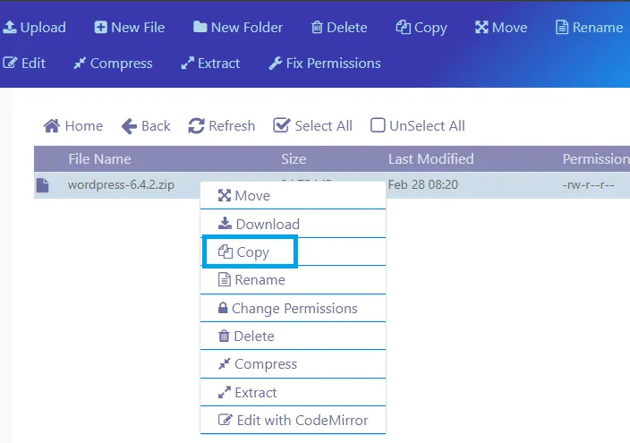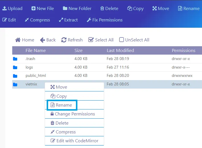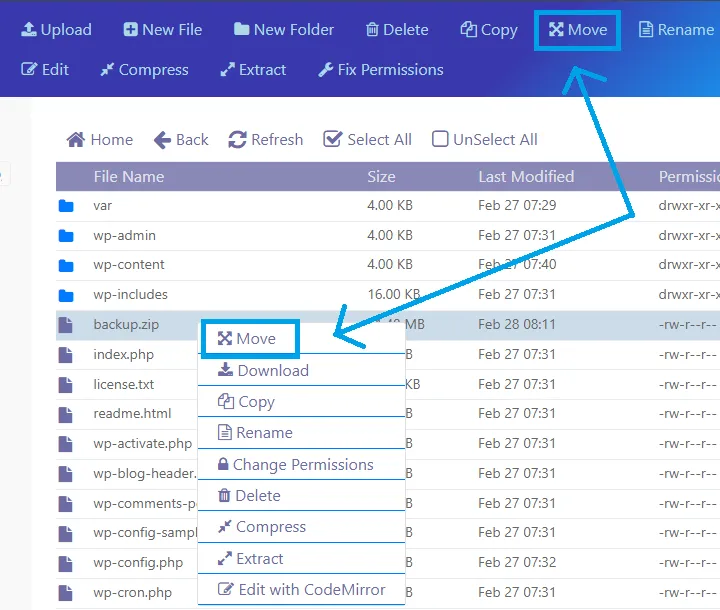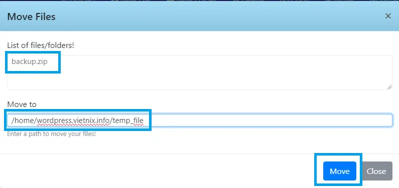 Di chuyển file thường sử dụng khi bạn muốn tổ chức lại không gian lưu trữ hay sử dụng lại làm dữ liệu cho website khác tương đồng website cũ. Thao tác thực hiện khá đơn giản, bạn chỉ cần chọn các file bạn muốn và nhấn nút Move trên thanh menu của Cyber Panel. Hoặc bạn có thể chuột phải và chọn dòng Move trong bảng menu pop-up.