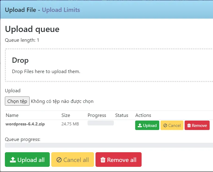 Nếu có một số file cần đưa lên server Cyber Panel, bạn hãy tiến hành như sau: Trên thanh menu bạn sẽ thấy nút Upload file cạnh nút New File, bấm vào nó và hệ thống hiện lên bảng hàng chờ upload.