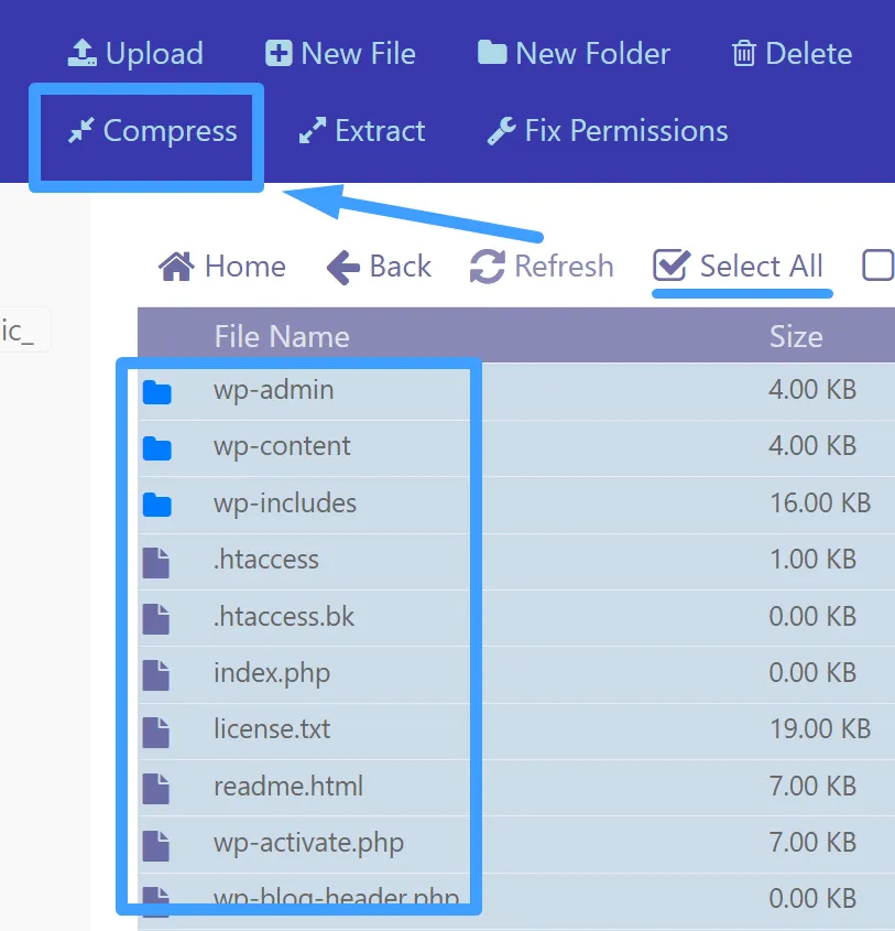 Tại đây, bạn sẽ chọn các file hay folder cần được nén (Click từng file được chỉ định hoặc chọn tất cả bằng Select All) và nhấn vào nút Compress trên thanh menu.