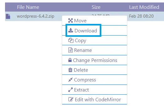 Trên Cyber Panel có sao lưu file dữ liệu và bạn muốn tải các file này, hãy thực hiện theo các bước sau: Bạn chọn các file cần download và nhấn chuột phải lên chúng, tiếp tục chọn dòng Download để tải file về máy.