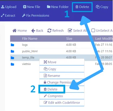 Trong Cyber Panel có 2 cách để xoá một file /folder. Bạn sẽ chọn file hoặc folder cần xoá, bấm nút Delete của thanh menu ở trên cùng. Tuỳ chọn thứ 2 là bạn bấm chuột phải vào file/folder đó và menu pop-up hiện ra, chọn dòng Delete.