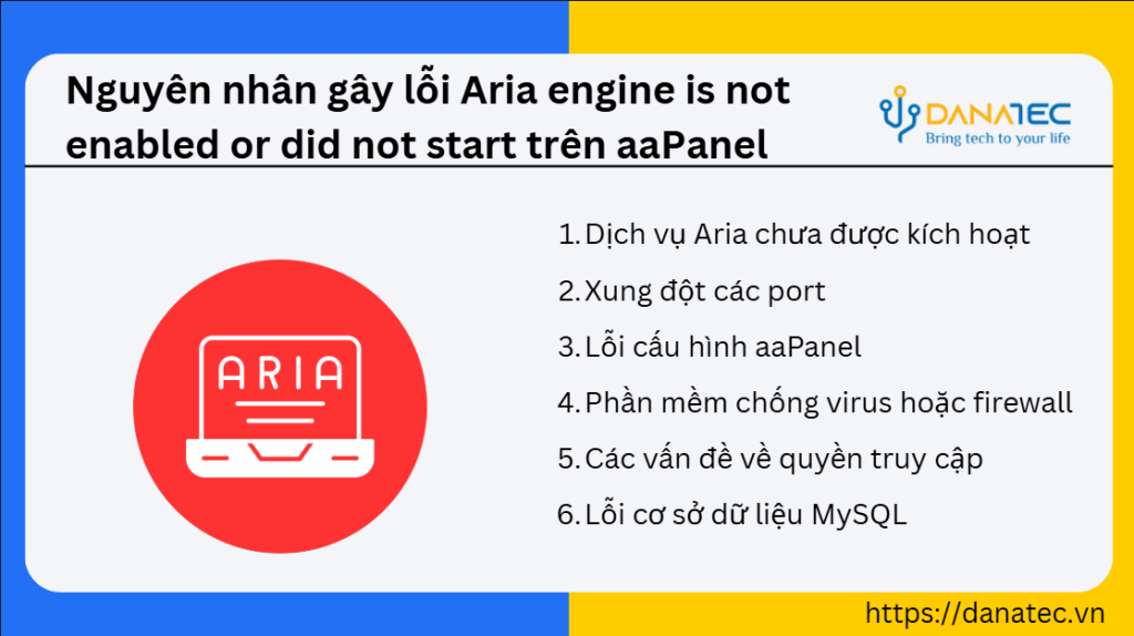 Lỗi Aria engine is not enabled or did not start trên aaPanel có thể gây ra những khó khăn đáng kể cho người quản trị hệ thống. Trong quá trình quản lý server và ứng dụng web, việc gặp phải thông báo lỗi này có thể làm gián đoạn hoạt động của website hoặc ứng dụng của bạn. Trong bài viết này, hãy cùng Danatec tìm hiểu về nguyên nhân gây ra và các phương pháp khắc phục phổ biến để bạn có thể nhanh chóng khắc phục lỗi Aria engine is not enabled or did not start trên aaPanel.