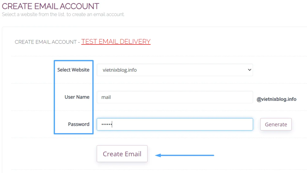 - Select Website: Chọn tên website mà bạn muốn tạo email theo đuôi website đó.