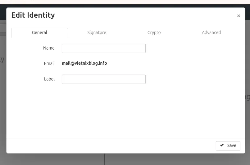 Khi bạn đăng nhập lần đầu tiên vào SnappyMail sẽ thấy cửa sổ Edit Identity (Chỉnh sửa danh tính), điều đó có nghĩa là hệ thống yêu cầu bạn cấu hình thông tin danh tính email để sử dụng trong quá trình gửi thư.