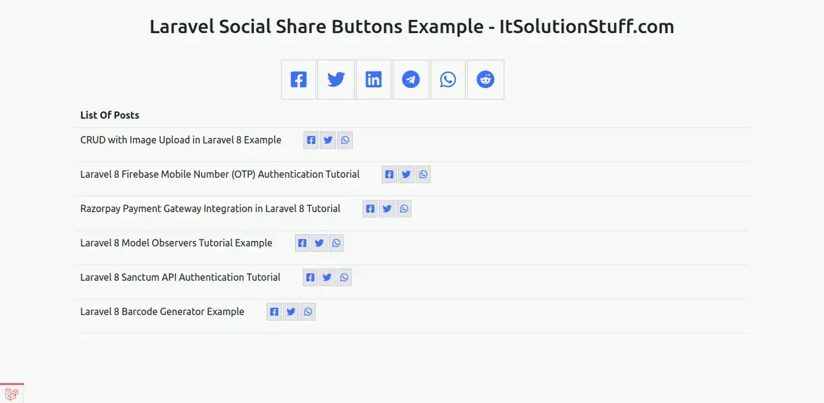 Here we will use jorenvanhocht/laravel-share composer package for adding social media sharing buttons in laravel project. you can easily use this example with laravel 6, laravel 7, laravel 8, laravel 9 and laravel 10. jorenvanhocht/laravel-share provide social sharing option for facebook, twitter, linkedin, telegram, whatsapp and reddit.
