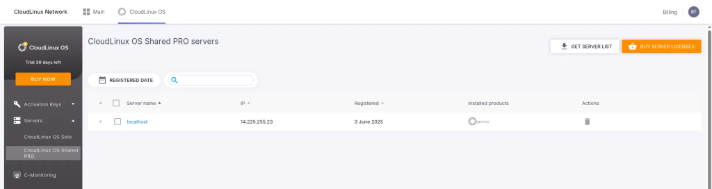 Sau khi hoàn tất cài đặt, bạn cần kiểm tra xem server đã sử dụng CloudLinux làm subsystem hay chưa. Để kiểm tra, hãy truy cập vào CloudLinux Network. Tại đây, bạn có thể xác nhận trạng thái kết nối của hệ thống.