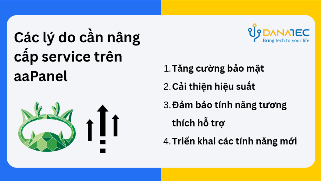 - Các lý do cần nâng cấp service trên aaPanel: Hiểu được tầm quan trọng của việc nâng cấp service trên aaPanel, bao gồm các lợi ích về bảo mật, hiệu suất, hỗ trợ và tính năng mới.