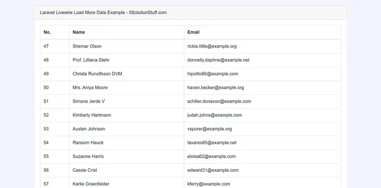 In this tutorial we will go over the demonstration of laravel livewire load more data example. i would like to share with you laravel livewire onscroll load more data. you will learn auto load more data on page scroll laravel livewire. let’s discuss about laravel 8 livewire load more example. you will do the following things for load more data on page scroll in laravel livewire.